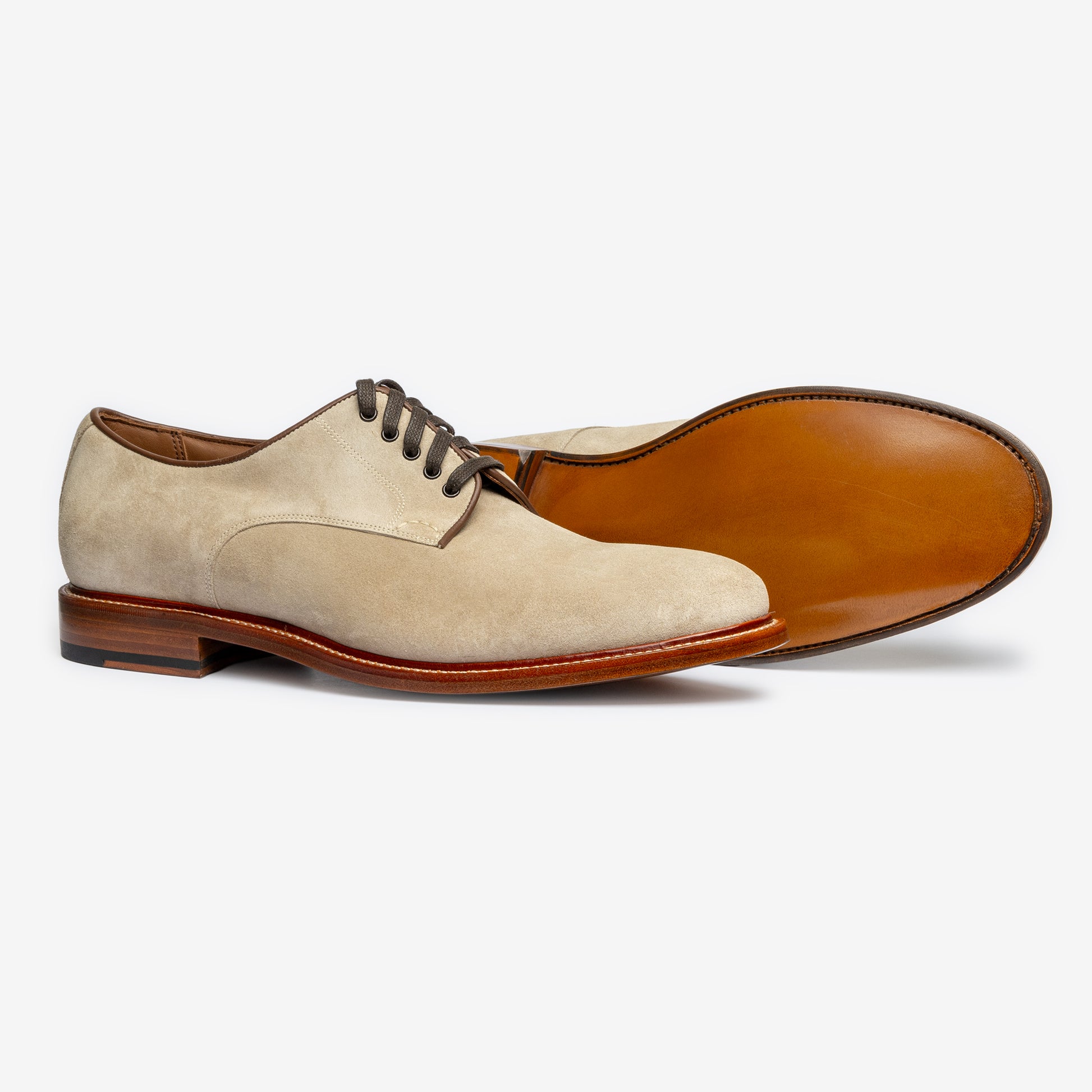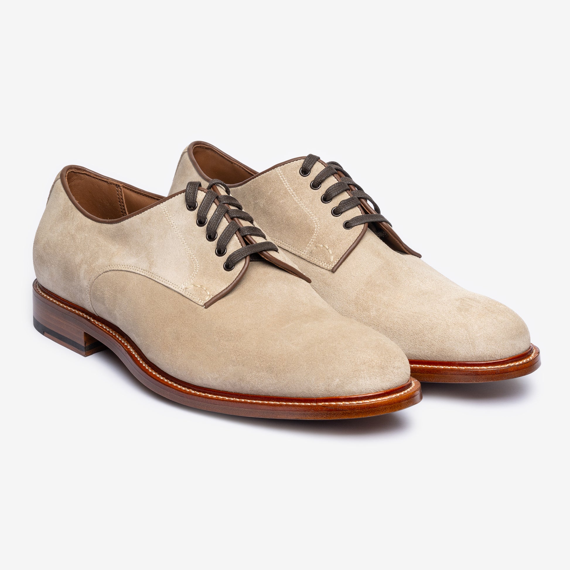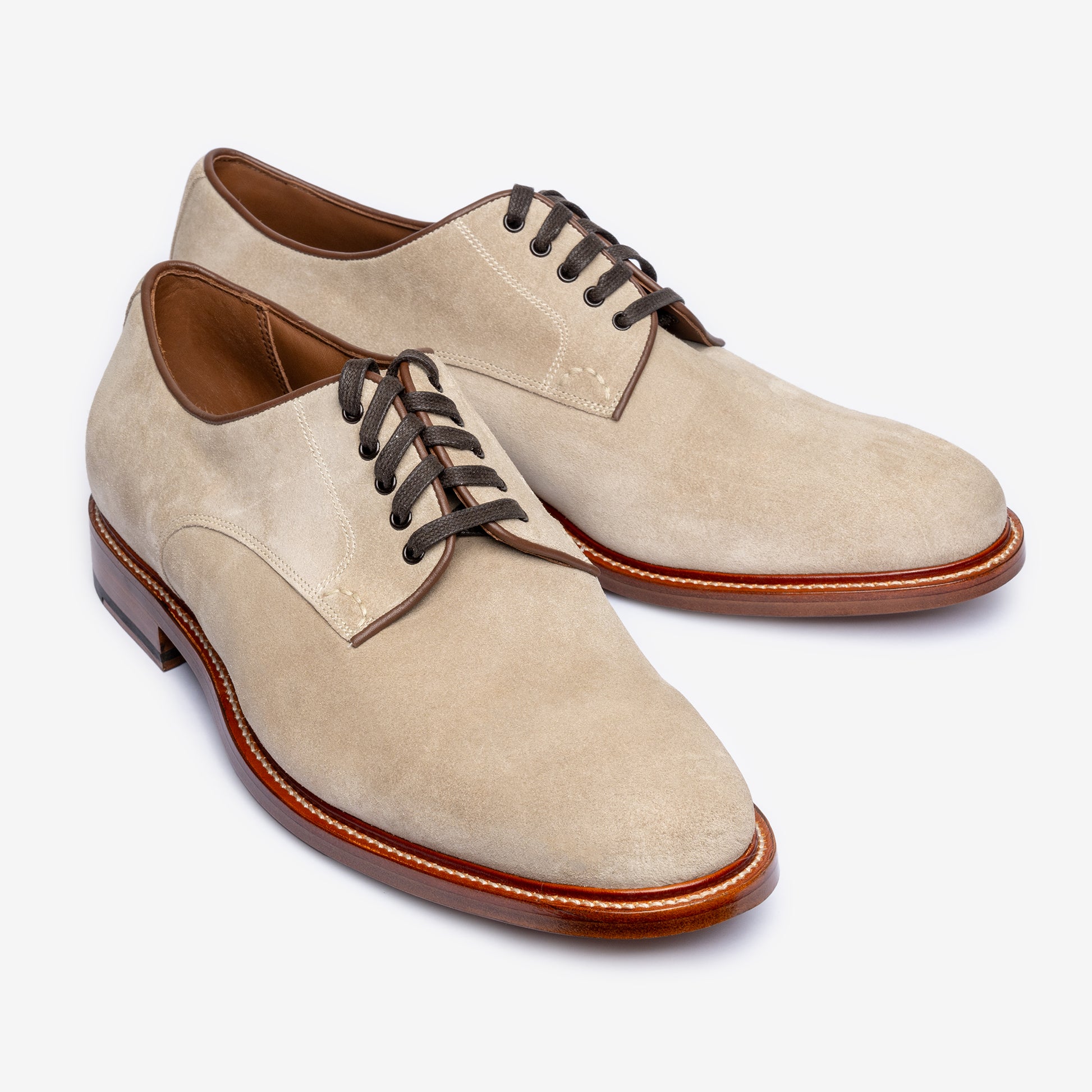 The seat area fits more snug to the heel as leather board counter is a more breathable and living material adding to a comfortable and good fit. The heels are stacked layer by layer and nailed top-down making for a robust yet clean, premium finish.