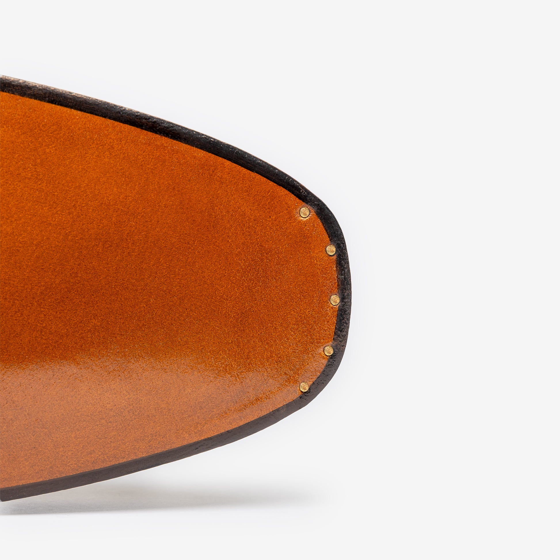 Oak bark tanned outsoles are waterproof and extremely abrasion resistant, flexible while having structure,  comfortable to wear and break in and can distinguished by its attractive grain and warm, woody colour.